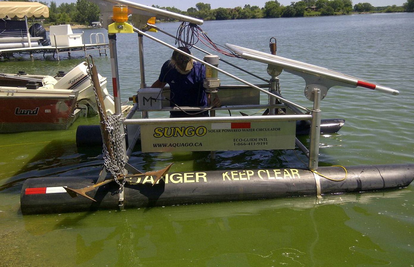 位于美國(guó)南達(dá)科他州Harbor Bay的Madison湖長(zhǎng)期接收周?chē)r(nóng)業(yè)面源污染、地表徑流和市政污水的污染物入湖,湖底堆積的底泥常年向水中釋放污染物,導(dǎo)致湖體水質(zhì)富營(yíng)養(yǎng)化嚴(yán)重 。2012年6月初由于干旱湖水水面下降,藍(lán)藻大規(guī)模爆發(fā)。根據(jù)該項(xiàng)目現(xiàn)場(chǎng)踏勘及底泥調(diào)查結(jié)果,設(shè)計(jì)將三臺(tái)奧科?太陽(yáng)能循環(huán)復(fù)氧設(shè)備以三角形點(diǎn)位布設(shè)。